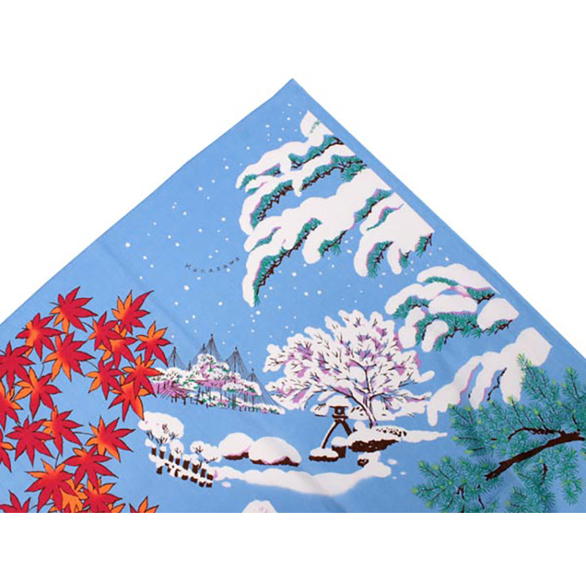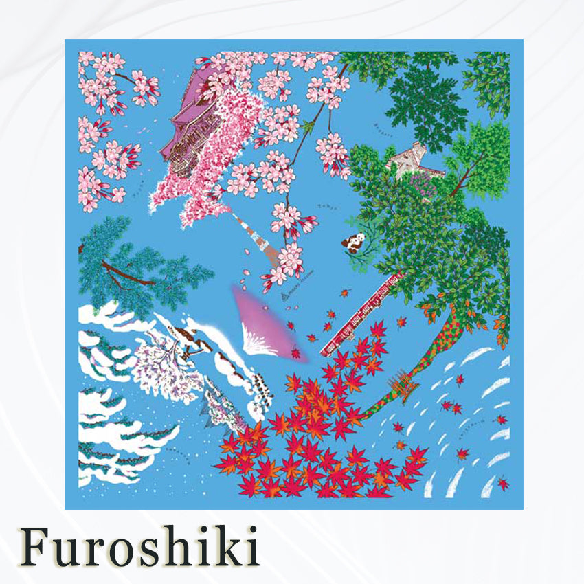 This furoshiki beautifully illustrates Japan’s seasonal transitions: cherry blossoms, Mt. Fuji, lush greenery, autumn leaves, and snow. A poetic and peaceful reflection of the Japanese spirit throughout the year.