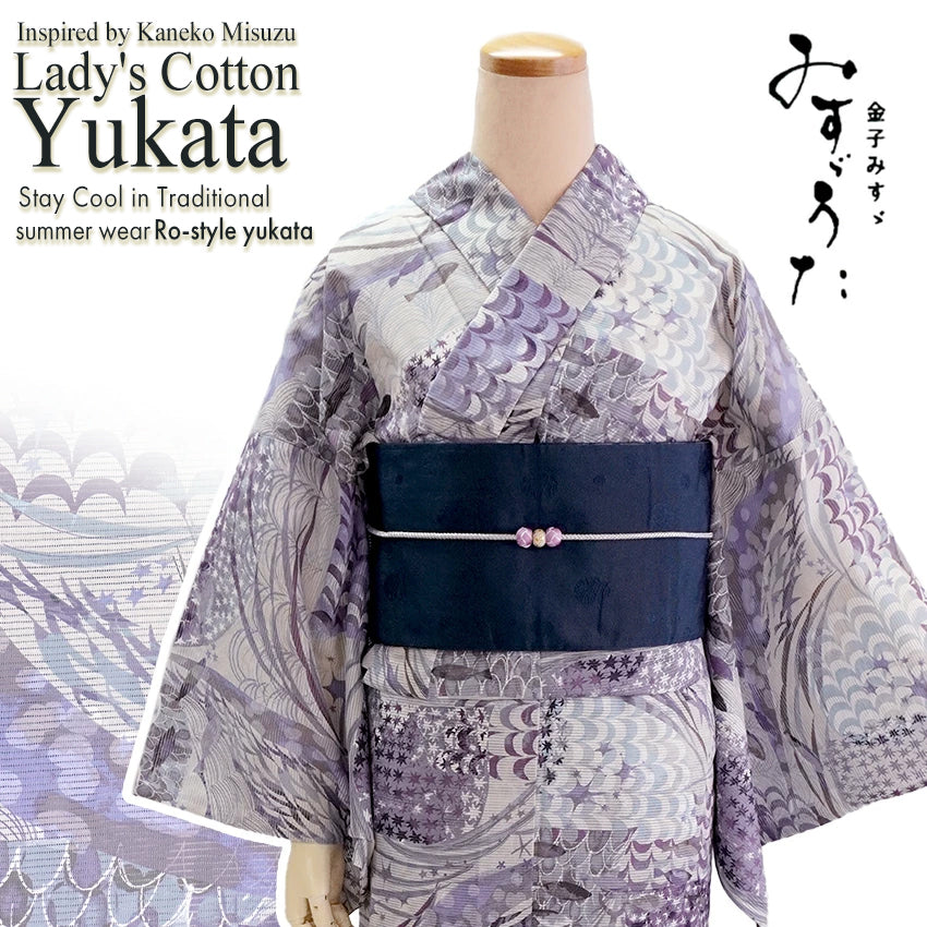 Float into a seafaring dream with our Gray Waves Lullaby Yukata. Drawing from Misuzu’s “Nami no Komoriuta,” this design features gently swaying shells and fish in soft gray and purple tones, evoking peaceful marine lullabies.