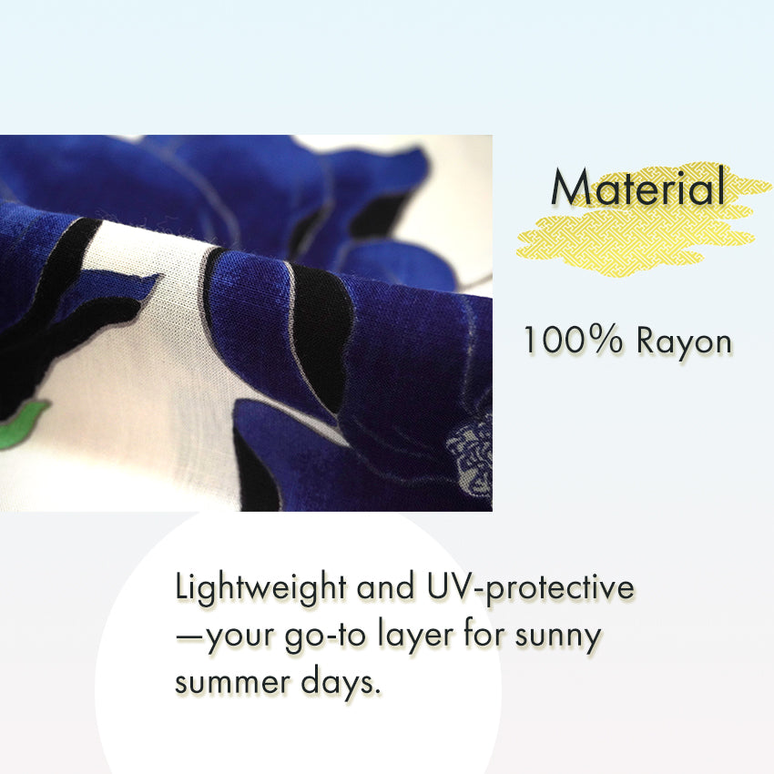 Made from soft, airy rayon, this long-sleeved kimono-style haori drapes comfortably over the body. The slightly longer length covers the hips, while the relaxed sleeves offer easy layering. UV protection is built in, making it an ideal summer piece for both style and sun defense.