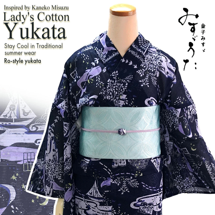 Lightweight Cotton Yukata for Women, Deep Indigo base, Whales, waves, stars, fish and birds pattern – Inspired by Kaneko Misuzu’s Poetry, Summer Japanese Kimono Robe