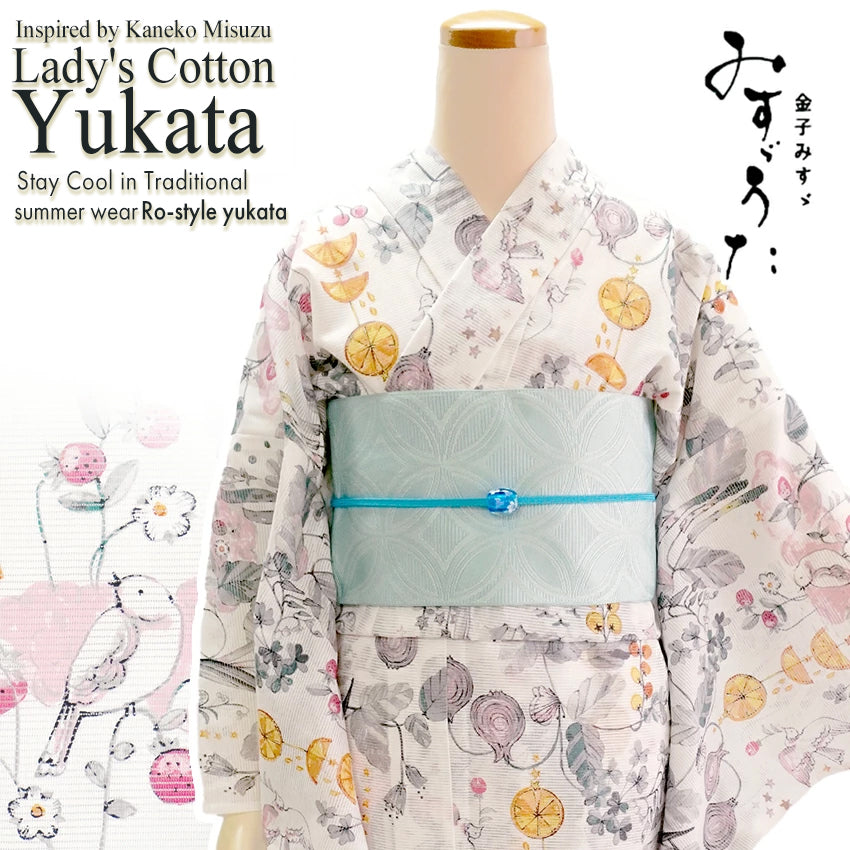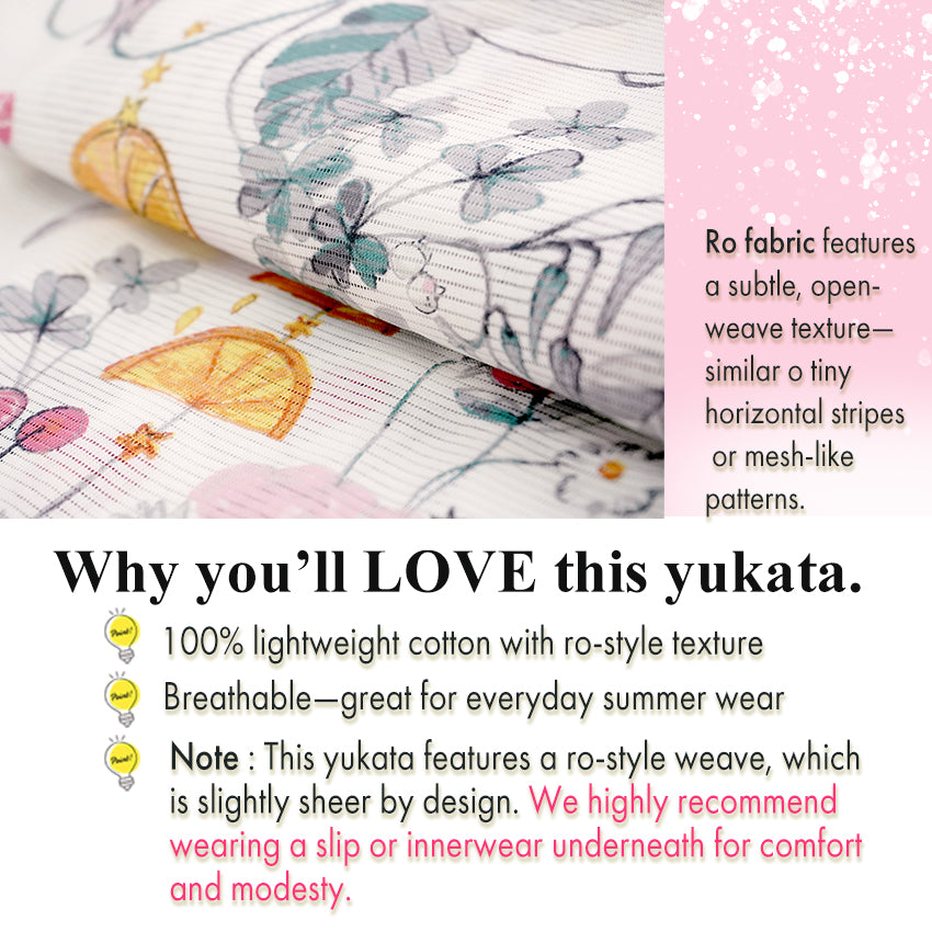 Lightweight Cotton Yukata for Women, red, pink, gray base, vegetables, cats, birds pattern– Inspired by Kaneko Misuzu’s Poetry, Summer Japanese Kimono Robe