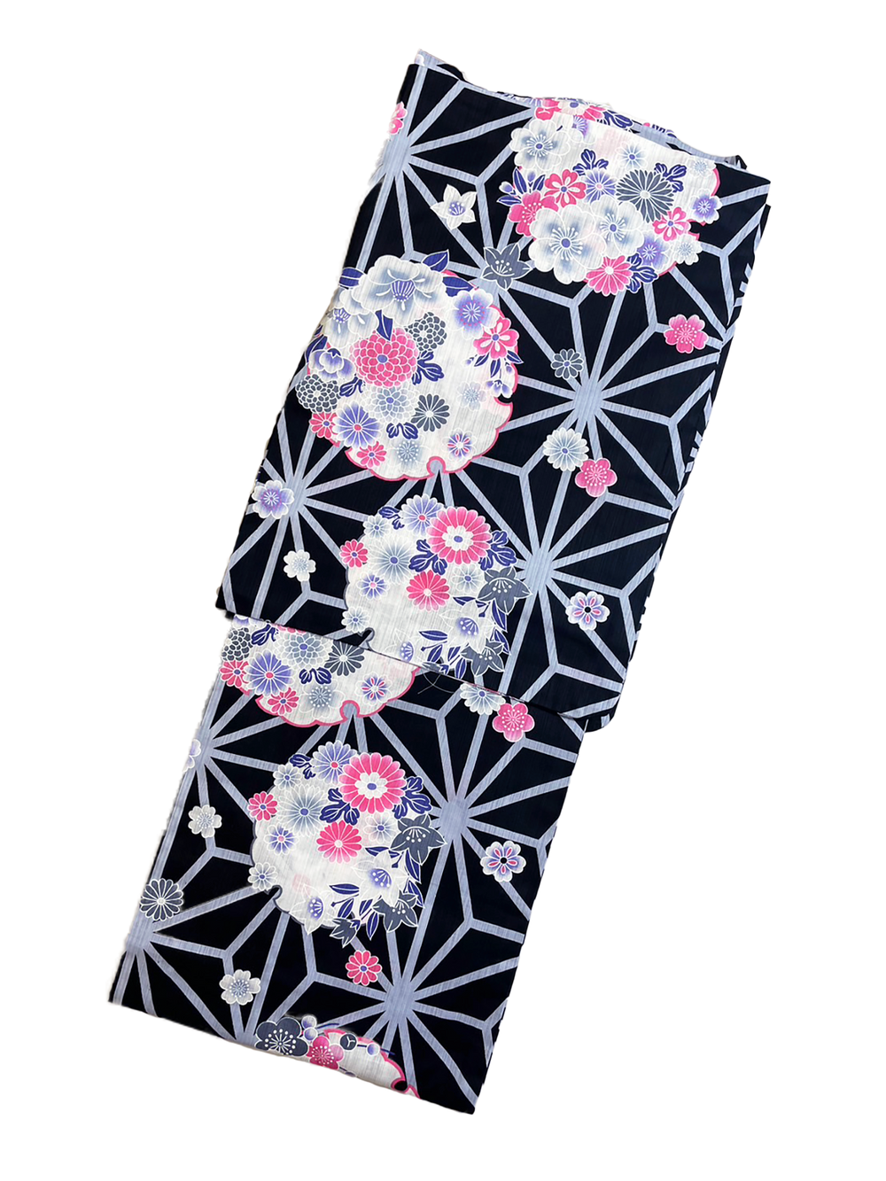 Women's Cotton Yukata Coordinate Set For Beginners : Black bloom flower & Pink obi