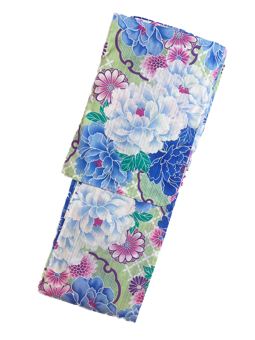 Women's Cotton Yukata Coordinate Set For Beginners : Blue, Flowers & Pink obi