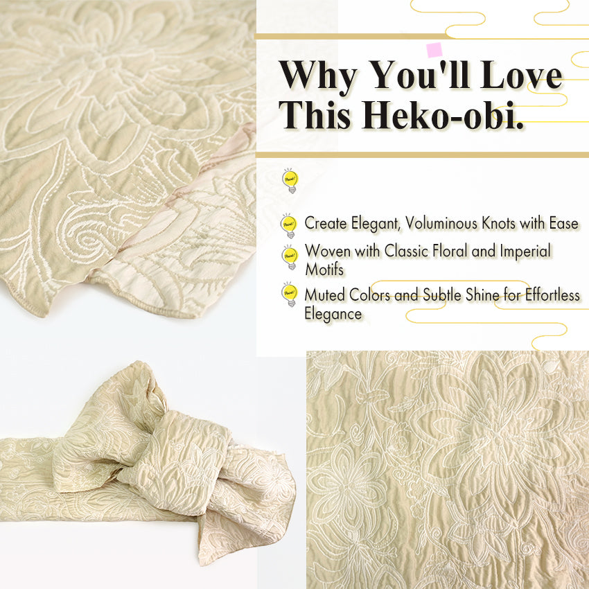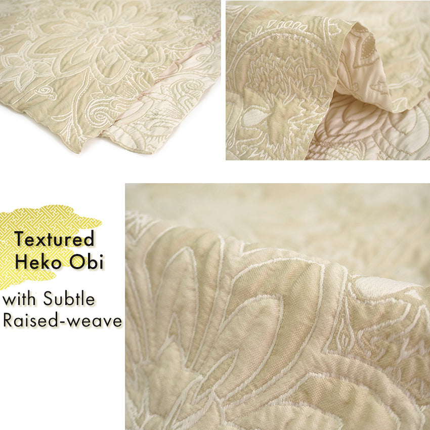 Light, airy, and effortlessly elegant—this heko obi features a beautifully textured jacquard weave that gives volume without weight, making it easy to tie and stunning from every angle.